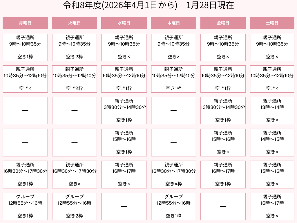 お子さまの発達や生活スタイルに合わせて、曜日ごとに組み合わせた段階的なご利用、振替えも可能です。 親子通所クラスでは親子同室を推奨しますが、ご都合に合わせて保護者の方のみ退室や外出を行うことも可能ですので、ご相談ください。 ※1日の定員は10名です。